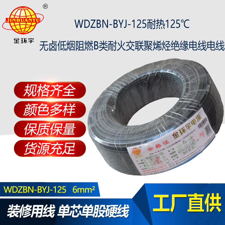 WDZBN-BYJ-125:即為低煙無鹵阻燃B類耐火電線,是指電線的絕緣層材料鹵素物質,在燃燒的情況下,不釋放含鹵氣體,煙霧濃度低,參照標準為JB/T 10491-2004,型號有WDZAN-BYJ-125、WDZBN-BYJ-125、WDZCN-BYJ-125等,