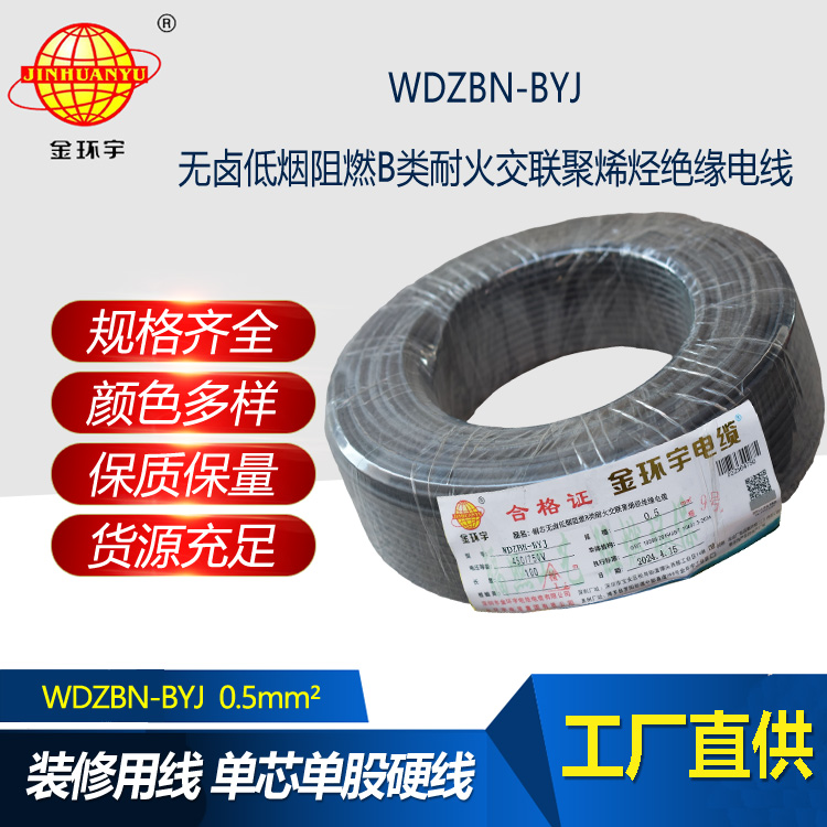“WDZBN-BYJ”為銅芯交聯(lián)聚乙烯絕緣無鹵低煙B類阻燃耐火布電線。