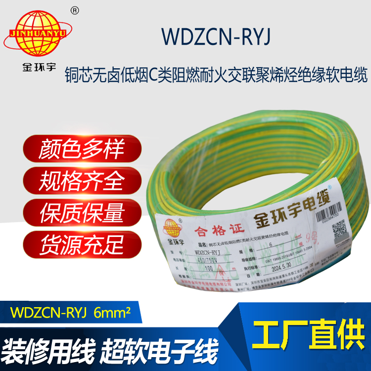 金環宇電線電纜 6平方電線 低煙無鹵阻燃耐火電線 WDZCN-RYJ 6平方