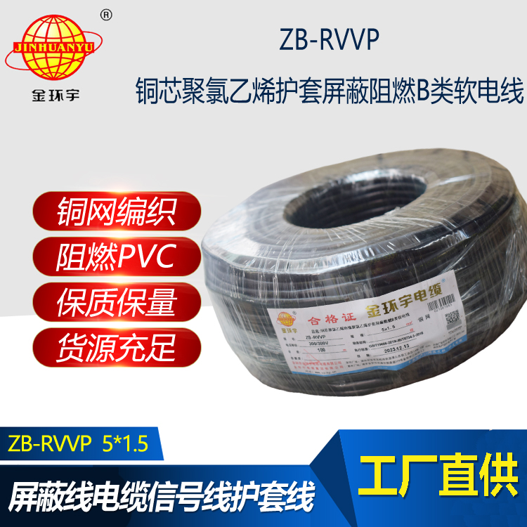 金環宇電纜 屏蔽阻燃電纜ZB-RVVP 5X1.5平方 rvvp屏蔽電纜