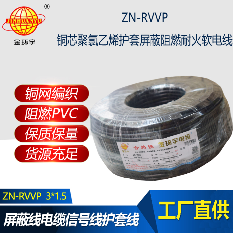 金環宇電線電纜 銅芯屏蔽軟電纜 阻燃耐火ZN-RVVP 3X1.5平方 深圳廠家