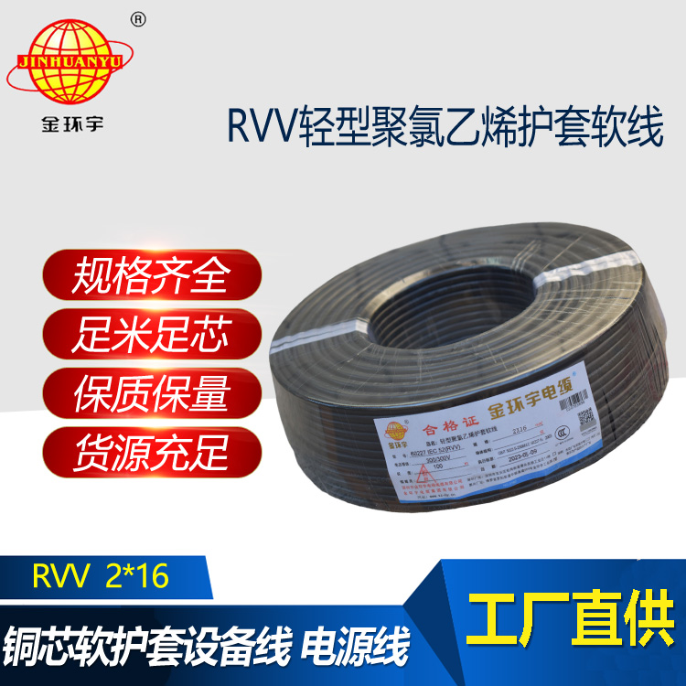 RVV2*16平方電纜是2根16平方銅芯交聯聚乙烯絕緣聚氯乙烯護套電力電纜,帶阻燃特性。阻燃—ZR 阻燃A類,阻燃B類,阻燃C類。金環宇電線電纜產品上千種,歡迎來電咨詢。