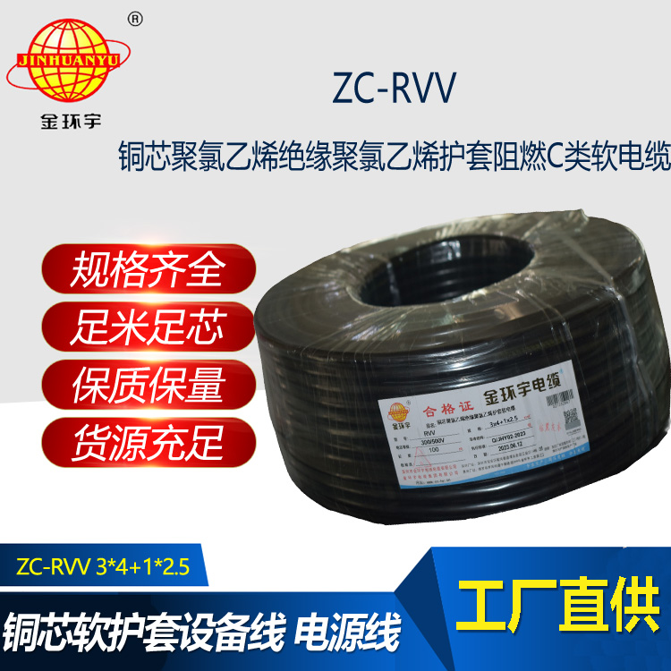 金環宇 深圳阻燃rvv電纜報價ZC-RVV 3X4+1X2.5 電源線