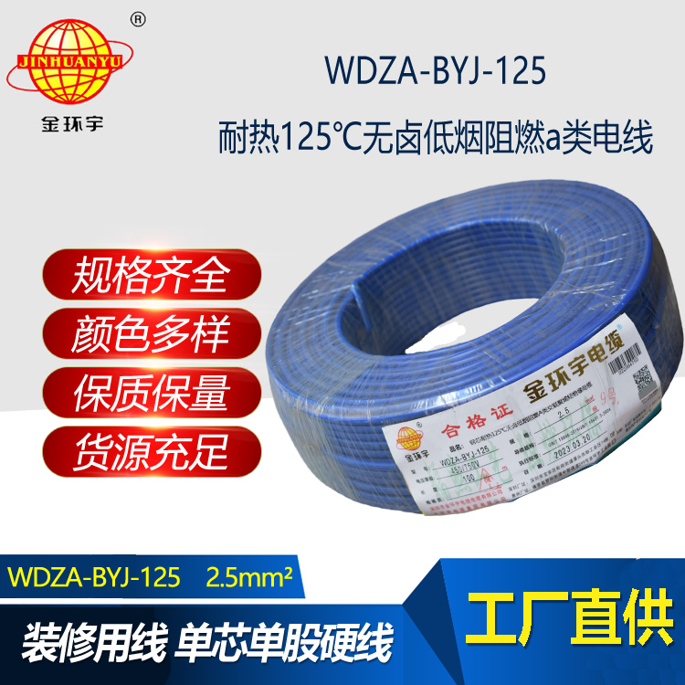 WDZA-BYJ-125全稱為耐熱125℃無鹵低煙阻燃A類交聯聚烯烴絕緣電纜;符合解釋說明:WDZ表示低煙無鹵阻燃;A代表A類阻燃;B代表布電線;YJ表示交聯聚乙烯;