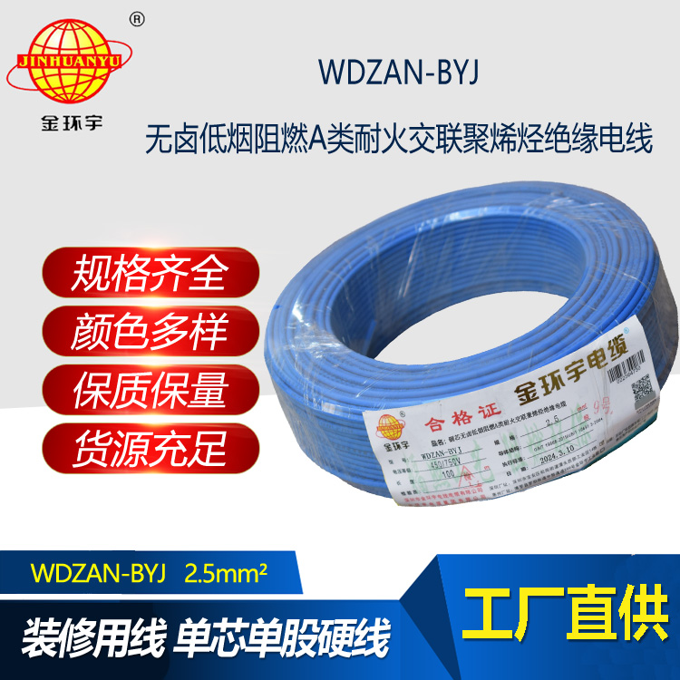 WDZAN-BYJ:即為銅芯無鹵低煙阻燃A類耐火交聯聚烯烴絕緣電線,是指電線的絕緣層材料鹵素物質,在燃燒的情況下,不釋放含鹵氣體,煙霧濃度低,參照標準為JB/T 10491-2004,型號有WDZAN-BYJ、WDZBN-BYJ、WDZCN-BYJ等,