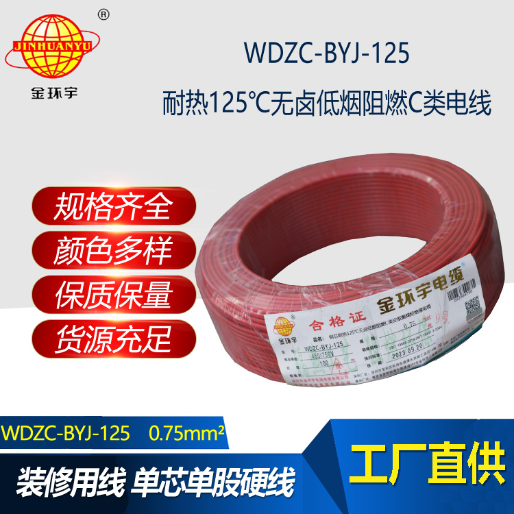 WDZC-BYJ-125℃全稱為耐熱125℃無鹵低煙阻燃C類交聯聚烯烴絕緣電纜;符合解釋說明:WDZ表示低煙無鹵阻燃;C代表C類阻燃;B代表布電線;YJ表示交聯聚乙烯;