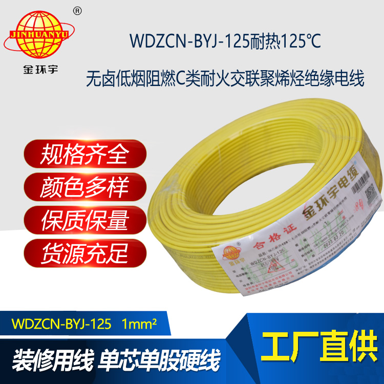 WDZCN-BYJ-125:即為銅芯耐熱125℃無鹵低煙阻燃C類耐火交聯聚烯烴絕緣電線,是指電線的絕緣層材料鹵素物質,在燃燒的情況下,不釋放含鹵氣體,煙霧濃度低,參照標準為JB/T 10491-2004,型號有WDZAN-BYJ-125、WDZBN-BYJ-125、WDZCN-BYJ-125等,