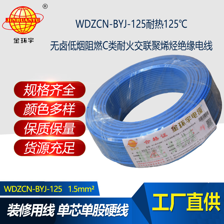 WDZCN-BYJ-125:即為銅芯耐熱125℃無鹵低煙阻燃C類耐火交聯聚烯烴絕緣電線,是指電線的絕緣層材料鹵素物質,在燃燒的情況下,不釋放含鹵氣體,煙霧濃度低,參照標準為JB/T 10491-2004,型號有WDZAN-BYJ-125、WDZBN-BYJ-125、WDZCN-BYJ-125等,