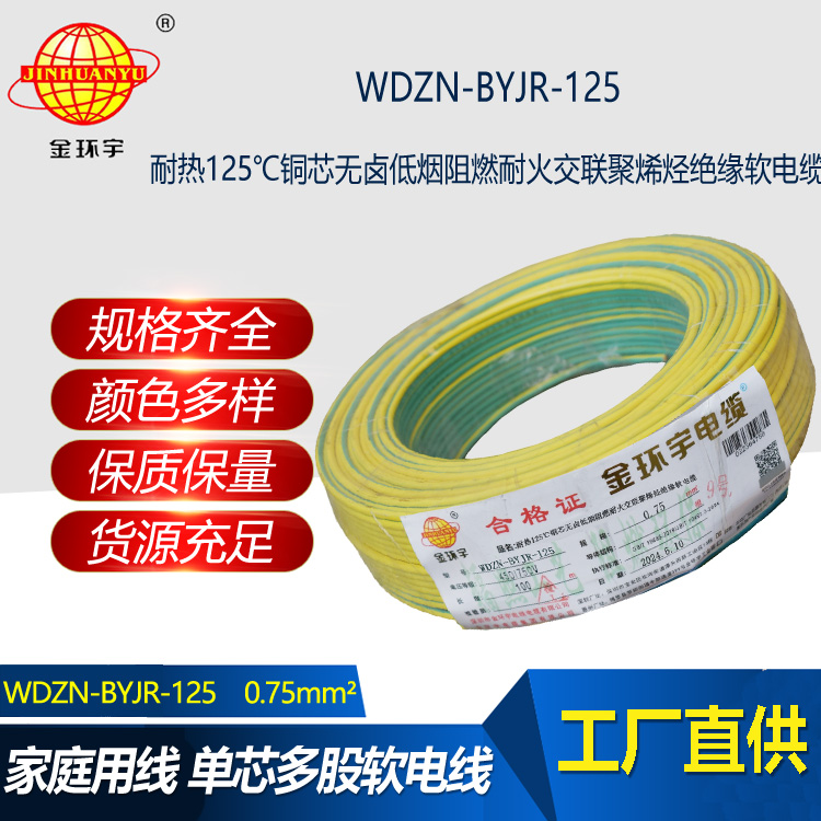 WDZN-BYJR-125是一種交聯聚乙烯新型裝修的布電線。WDZN-BYJR-125布電線的特點就是低煙量、無鹵素、阻燃、耐火。每個字母代表的意思:W代表無鹵;D代表低煙;Z代表阻燃;N代表耐火;125代表溫度可達到125℃,YJ代表交聯聚乙烯絕緣;R代表軟。其導體主要是銅線,有薄的絕緣層和良好的電氣機械性能,以及耐熱、防潮、耐溶劑等性能,選用不同的絕緣材料可獲得不同的特性。