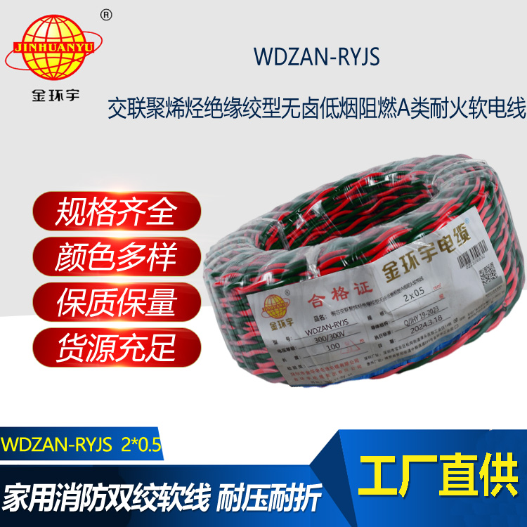 WDZAN-RYJS:低煙無鹵交聯聚烯烴絕緣a類阻燃耐火雙絞線;是消防用低煙無鹵阻燃耐火聚烯烴絕緣連接軟線是參照GB/T5023-2008等標準制訂的,其耐火特性符合GB/Tl9666類的要求。