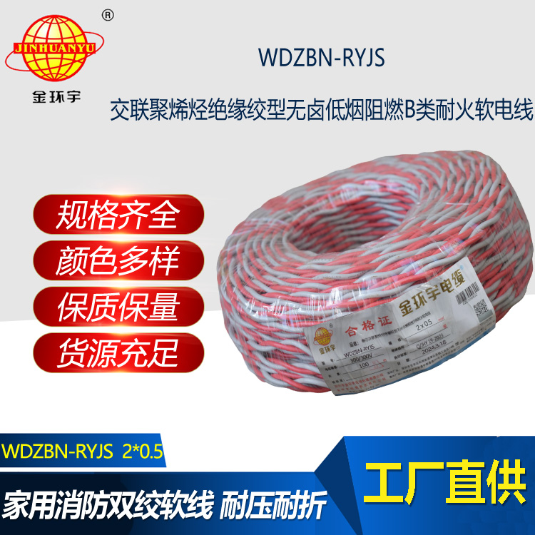 WDZBN-RYJS:低煙無鹵交聯聚烯烴絕緣B類阻燃耐火雙絞線;是消防用低煙無鹵阻燃耐火聚烯烴絕緣連接軟線是參照GB/T5023-2008等標準制訂的,其耐火特性符合GB/Tl9666類的要求。