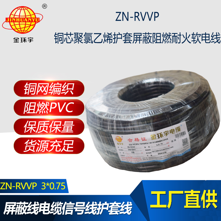 金環宇電線電纜 阻燃耐火銅編織屏蔽電纜ZN-RVVP 3X0.75 三芯rvvp電纜