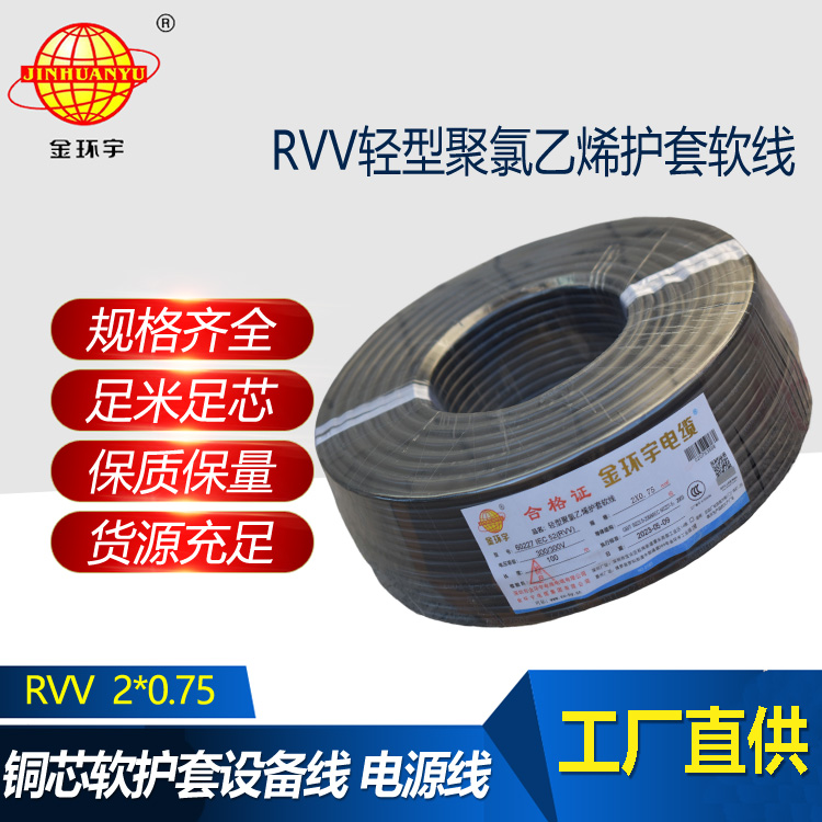 RVV2*0.75平方電纜是2根0.75平方銅芯交聯聚乙烯絕緣聚氯乙烯護套電力電纜,帶阻燃特性。阻燃—ZR 阻燃A類,阻燃B類,阻燃C類。金環宇電線電纜產品上千種,歡迎來電咨詢。