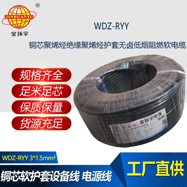 金環宇電線電纜 低煙無鹵阻燃軟護套rvv電纜WDZ-RYY 3X1.5平方