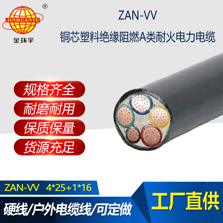 金環宇電纜 ZAN-VV 4X25+1X16平方4芯耐火電纜 a類阻燃電纜