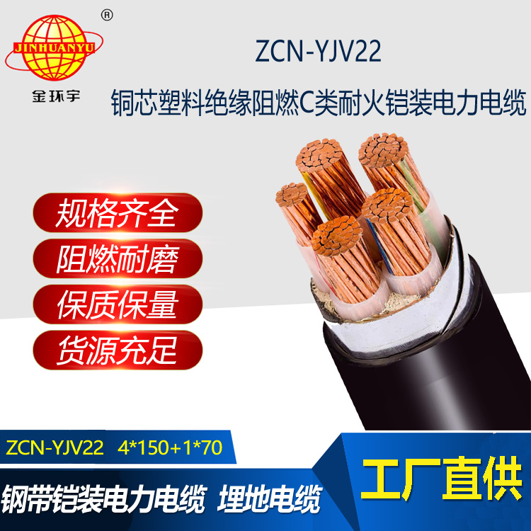 ZCN-YJV22電纜:銅導體C級阻燃耐火交聯聚乙烯絕緣聚氯乙烯內護層鋼帶鎧裝聚氯乙烯外護套 力電纜。C級阻燃(ZC)、耐火(N)電力電纜、交聯聚乙烯絕緣(YJ)、聚氯乙烯護套(V)、鋼帶鎧裝(22)